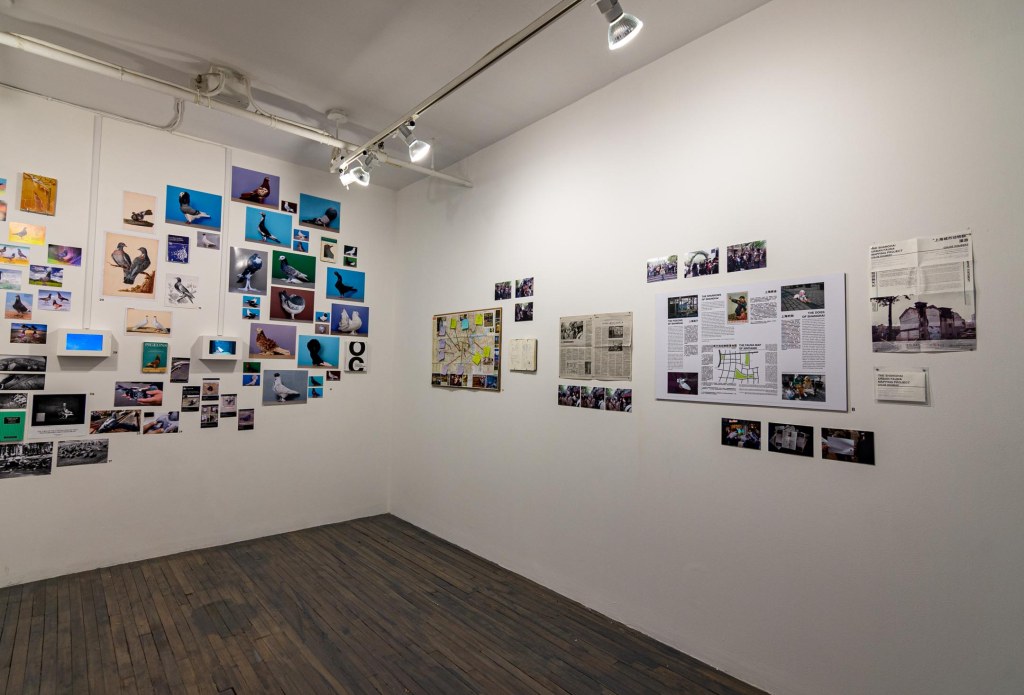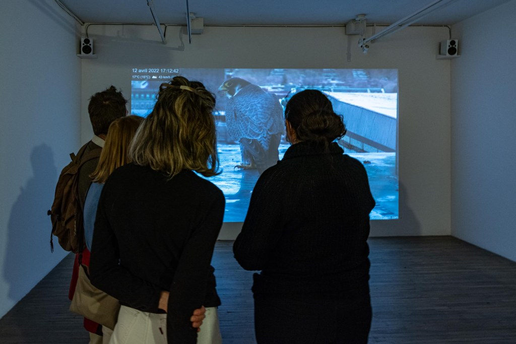 Through live broadcasting of images from the falcon nesting box at the Université de Montréal and pigeon walks by anthropologist-curator Chloé Roubert, the exhibition questions the different view of animal life, but also of social relations in an urban environment.