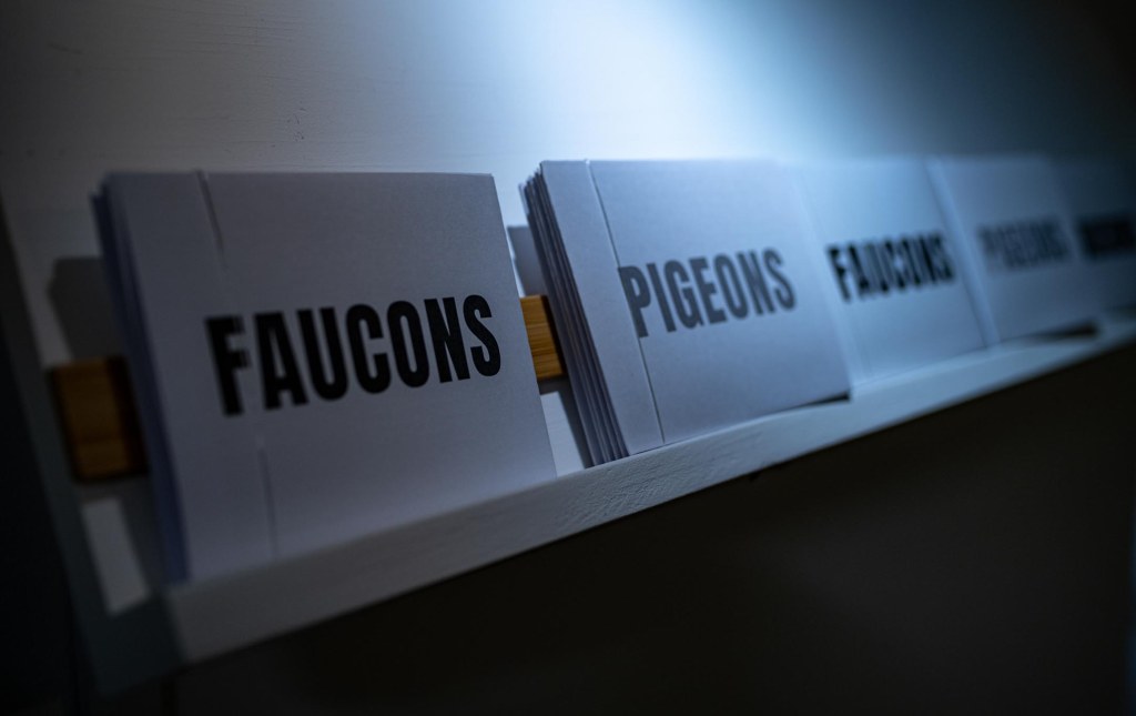 The projection of the nesting box immerses the gallery in an urban atmosphere. The height, the feeling of vastness, the reverse view of the city below and the wind blowing is omnipresent. Then there is the time, the slowness, the waiting, because the falcons are not at the disposal of the visitor’s gaze. This is perhaps what causes feeling of surprise every time one of them enters. The falcon is also a carnivore and a skilled hunter, especially of pigeons. The scenes of predation remind us of its animality, this wild side incongruous in the big city.