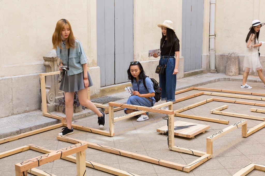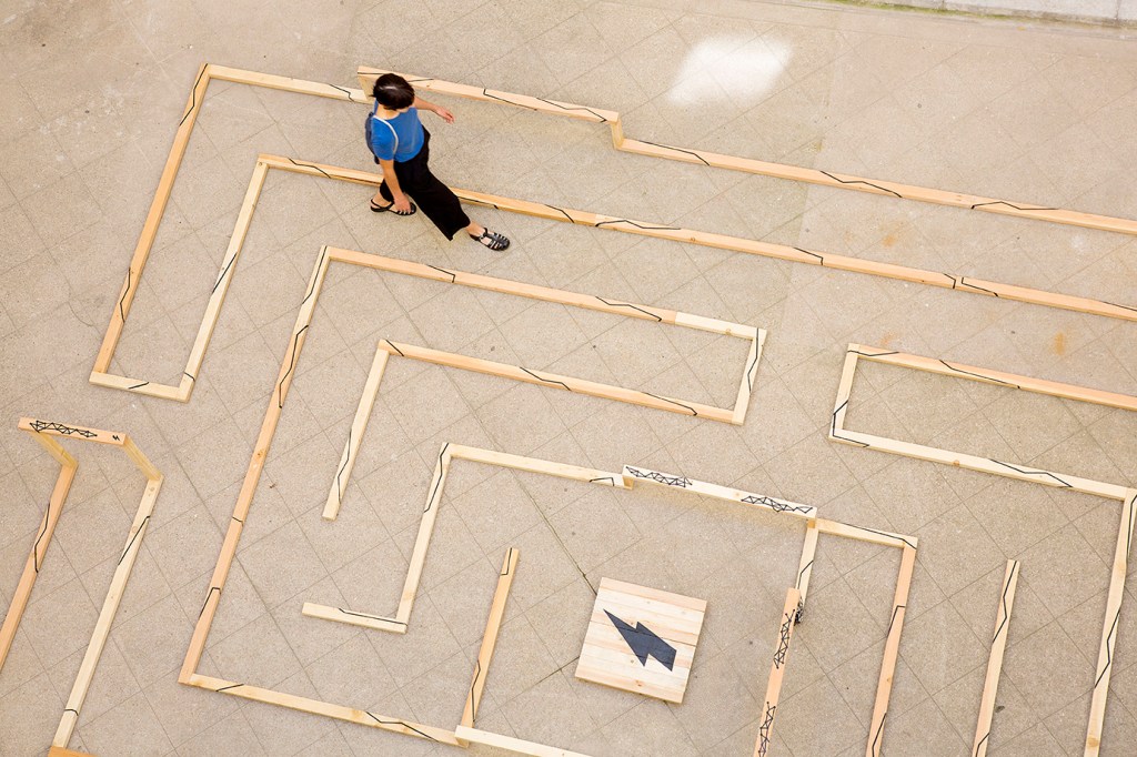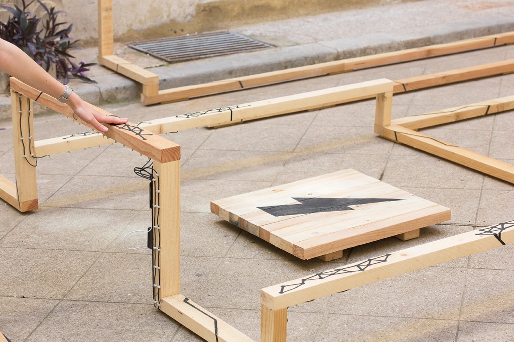 Nature Electrique is an interactive labyrinth where the visitor is invited to circulate and get lost through a topography built of wood and electric paint. Producing sound and visual stimulation, the material reacts to touch by transforming the wood into a real “sensitive surface”. Interactions act as landmarks or obstacles that the visitor must overcome to find his way.
