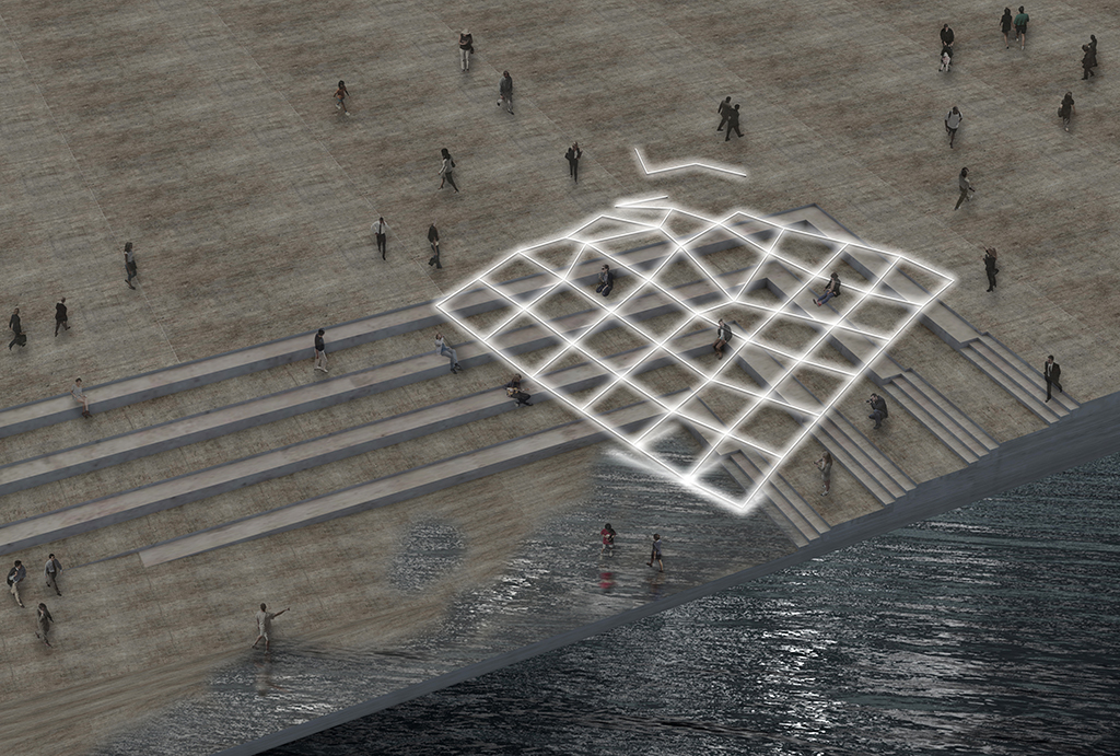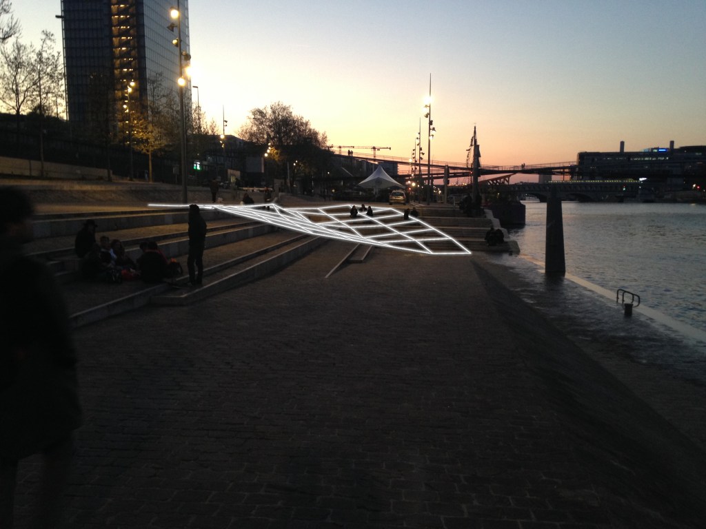 Naufrage est une surface de lumière échouée au bord de la Seine. Cette structure, une grille simple aux axes de dimensions identiques a heurté les berges et s’en retrouve brisée. Une embarcation vétuste transportant des personnes fuyant le chaos prend une forme sensible en se manifestant comme un signe lumineux qui vient d’ailleurs. Il met en lumière une présence qui se manifeste de nos jours et qui suscite en nous un nouveau rapport au monde et à ses limites. L’installation est un lieu de repos relié à l’eau où le public pourra faire une pause durant son parcours. Le visiteur est spectateur du franchissement qu’a vécu cette surface. Immergé dans ce « bateau », il est invité à s’y installer et à réfléchir sur l’état du monde et ses frontières.