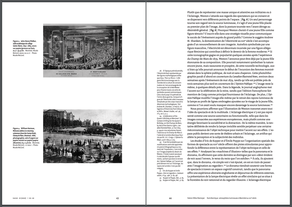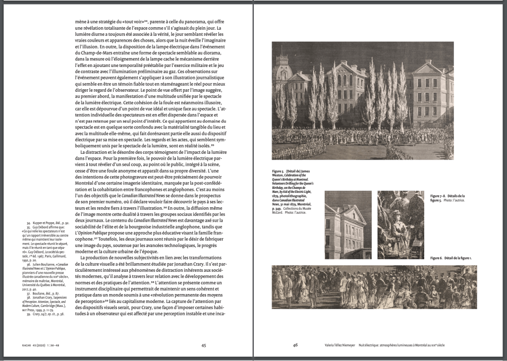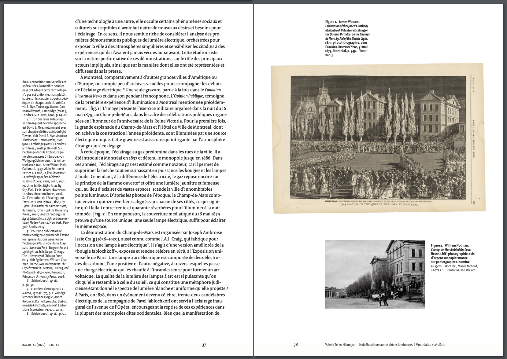 In Montréal, the first public demonstration of electric lighting took place in 1879, on the Champ-de-Mars, and was coordinated with a military exercise in honour of Queen Victoria’s birthday. At the end of the nineteenth century, modes of experiencing the urban environment by night changed through a series of public demonstrations. These events were ephemeral spectacles designed to expose city dwellers to the unusual effects of electric light. These early experiences with electric light gave rise to new forms of subjectivity that would later be embodied in the everyday spaces of cities. To better understand the impact of electric lighting on the constitution of modern public spaces in Montréal, this article examines the performative nature of the first demonstration in the city in 1879, the role of the main actors involved, and how it was visually represented and disseminated in the press.